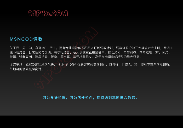 线下相结合,日常任务与训练、考核相结合,私人调教室正在筹备中。擅长犬化,肉体调教,精神控制;SP、耳光、