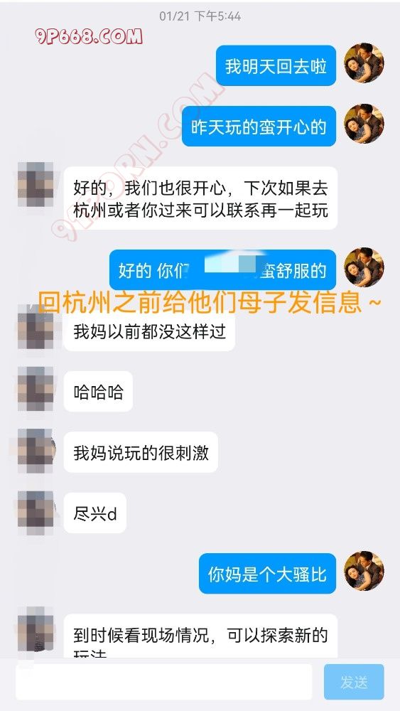 我们第一轮结束整整干了一个半小时,本来想叫他们母子一起出去吃中饭的,但是他们建议把饭菜点到酒店,我们吃完继续又干了一个多小时,这戏我给他妈妈用绳子捆绑起来,丰腴的身体捆绑起来特别性感,让她穿上肉的亮丝,显得特别的风骚,真的太刺激了。这次经历要发给他们母子看,他们两个一直催着我写出来,加上过年又出来旅游了,所以耽误了,还有很多细节没有写出来,希望下次玩再写一个帖子,真的很刺激。我把我们聊天的截图发在帖子里面,由于要保护隐私,照片就发她儿子拍的两张,希望大家看看帖子就可以,不要问我要照片和视频,如果有同样爱好的朋友也可以联系我,除了夫妻交友以外,还有一些母子,父女,公媳,姐弟等之类的朋友也可以一起交流一起玩,那些意淫口嗨或者骗子请不要联系我哦,谢谢了。